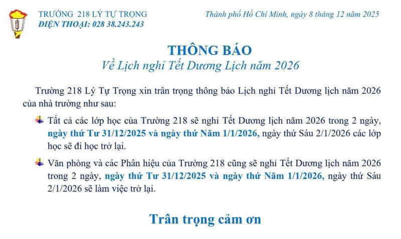 THÔNG BÁO LICH NGHỈ TẾT DƯƠNG LỊCH NĂM 2026